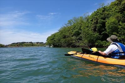ゴムボートタイプのカヤックを操り、親子で親子で力を合わせて大聖寺川に漕ぎ出そう!