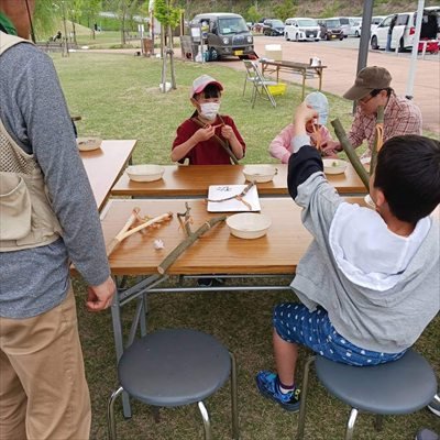 木の枝を使用して、ゴムぱちんこを作ります。輪ゴムに玉を引っかけ、グッっとひっぱって...。うまく飛ばせるかな?