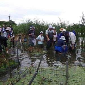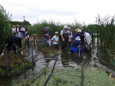 傾斜のゆるやかな水辺を保全している場所で、ごみ拾いと生きもの観察をおこない、ヨシや枝を束ねたものを水中に漬けて水生動物が住みやすい環境をつくります。