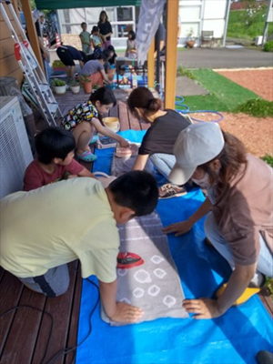 玉ねぎや、桑の実、ブルーベリーなどの染め液でバンダナや巾着袋に模様をつけて染め遊びを楽しみます。